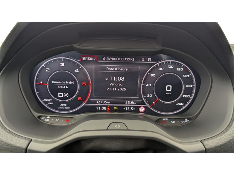 Accoudoir central AVAffichage de perte de pression des pneusAirbags latéraux AV avec système d'airbags de têteApplications décoratives Laqué ArgentAssistant de feux de routeAudi Drive SelectAudi Hold AssistAudi Parking System PlusAudi pre sense frontAudi Smartphone InterfaceAudi Sound System avec 10 HPAudi Virtual CockpitBlade Gris ManhattanCiel de pavillon en tissu Gris TitaneClé Confort (Keyless entry)Climatisation automatique 2 zonesDésactivation de l’airbag passager AVDétecteur de pluie et de luminositéFeux AR rouges, avec feux de recul blancs et feu de brouillard AR intégré à ampoules ; feux de plaque AR à LEDInterface BluetoothJantes en aluminium, 5 branches en Y, 7,0J x 17, avec pneus 215/55 R17 [U47]Lève-vitres électriques AV et ARPack Aluminium Intérieur : Eléments sur les diffuseurs d'air, les boutons de réglage des rétroviseurs, l'encadrement de la commande intérieure de verrouillage des portières, les lève-vitres, les touches de commande du frein de stationnementPack assistance stationnement : Caméra de recul Audi Parking System PlusPack confort : Rétroviseur intérieur jour/nuit automatique Appuis lombaires Rétroviseurs extérieurs réglables et escamotables électriquement, jour/nuit automatique, dégivrants des deux côtés et buses de lave-glaces dégivrantesPack Eclairage : Eclairage au niveau des pieds à l'AV Module de pavillon à l’AV incluant spots de lecture Eclairage AR Eclairage du coffre Miroirs de courtoisie éclairésProjecteurs avant à LED [8EX]Réception radio numérique DABSellerie Cuir/simili cuirSiège conducteur et passager AV réglable en hauteurSièges AV SportVitres athermiquesVolant en cuir style 3 branches avec multifonctions