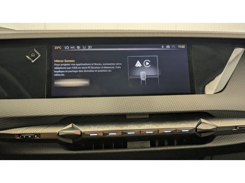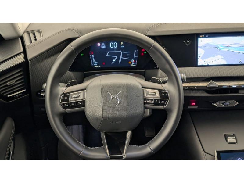 ABS avec répartiteur électronique de freinage (REF) et Aide au Freinage d'Urgence (AFU) + Aide au démarrage en penteAccès et démarrage mains libres ProximityAccoudoir central AR avec trappe à ski et 2 porte-gobeletsAide au stationnement AV et AR et Caméra de reculAirbags frontaux (passager déconnectable), latéraux AV, rideaux aux places AV/AR et central entre les places AVAlerte Attention ConducteurAlerte de franchissement involontaire de ligneAllumage automatique des feuxAntenne "aileron de requin"Avertisseur de risque de collisionBanquette AR 2/3 - 1/3 avec 3 appuie-têteClimatisation automatique bi-zoneCombiné numérique 7"Commutation automatique des feuxCondamnation automatique des portes et du coffre en roulantConsole centrale avec rangement ferméContrôle dynamique de stabilité (ESP) avec antipatinage des roues (ASR)Détection de sous-gonflageDS Drive Assist et Pack Détection Trafic AR : Adaptive Cruise Control Stop & Go Surveillance d'angles morts longue distance Alerte de Trafic AR Lane Positioning Assist afin de gérer la conduite de manière semi-autonomeDS e-toggle (Sélecteur de vitesses)DS EXTENDED HEAD UP DISPLAY Affichage tete haute étenduDS IRIS SYSTEMDS MATRIX LED VISIONEclairage d'ambiance à LEDEclairage de boîte à gants, d'accoudoir central AV et de coffre à LEDEclairage de cave à pieds à LEDEcran tactile capacitif 10" HDEssuie-vitre AV à déclenchement et cadencement automatiques + Buses de lavageFeux AR Full LED effet 3D avec traitement écaillesFixations ISOFIX à la place passager AV et aux places latérales ARFrein de stationnement électrique automatiqueFreinage d'urgence automatique piloté par caméra et radarIntérieur Cuir grainé Noir Basalte et Toile DS : Ciel de pavillon clair Décors de panneaux de porte Chrome guilloché Volant en cuir fleur Mistral Console centrale en Toile DS Mistral Planche de bord en toile DS Noir Basalte façon écaille Panneaux de portes Jantes alliage 19" SEVILLAKit de dépannage provisoire de pneumatiquesLève-vitres AV/AR électriques, séquentiels et antipincementMirror Screen sans fil via Wifi Compatible Apple CarPlay et Android AutoPack Sièges mécaniques avec réglages lombaires conducteur et passagerPalettes au volantPare-brise teinté acoustiquePare-soleil avec miroirs de courtoisie occultables éclairés à LEDPrises USB 1 prise USB-C sous l'accoudoir central AV, 1 prise USB-C dans la console et 2 prises USB-C pour les passagers ARRétroviseur intérieur électrochrome sans cadreRétroviseurs extérieurs électriques, dégivrants, rabattables électriquement Avec éclairage d'accueilRadio numérique terrestre (DAB) Inclut le BluetoothReconnaissance étendue des panneaux de circulationReconnaissance des panneaux de vitesse et préconisationVitres AR et lunette AR surteintéesVolant réglable en hauteur et profondeur