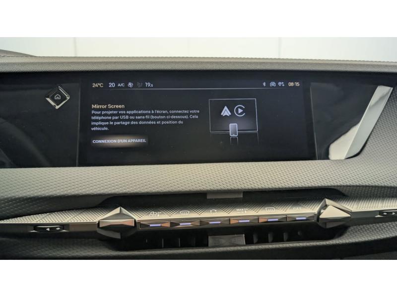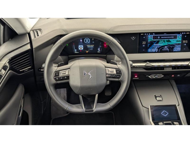 ABS avec répartiteur électronique de freinage (REF) et Aide au Freinage d'Urgence (AFU) + Aide au démarrage en penteAccès et démarrage mains libres ProximityAccoudoir central AR avec trappe à ski et 2 porte-gobeletsAide au stationnement AV et AR et Caméra de reculAirbags frontaux (passager déconnectable), latéraux AV, rideaux aux places AV/AR et central entre les places AVAlerte Attention ConducteurAlerte de franchissement involontaire de ligneAllumage automatique des feuxAvertisseur de risque de collisionBanquette AR 2/3 - 1/3 avec 3 appuie-têteClimatisation automatique bi-zoneCombiné numérique 7"Commutation automatique des feuxCondamnation automatique des portes et du coffre en roulantDétection de sous-gonflageDS Drive Assist et Pack Détection Trafic AR : Surveillance d'angles morts longue distance Alerte de Trafic ARDS e-toggle (Sélecteur de vitesses)DS EXTENDED HEAD UP DISPLAY Affichage tete haute étenduDS IRIS SYSTEMDS MATRIX LED VISIONEclairage d'ambiance à LEDEclairage de boîte à gants, d'accoudoir central AV et de coffre à LEDEclairage de cave à pieds à LEDEcran tactile capacitif 10" HDEssuie-vitre AV à déclenchement et cadencement automatiques + Buses de lavageFeux AR Full LED effet 3D avec traitement écaillesFixations ISOFIX à la place passager AV et aux places latérales ARFrein de stationnement électrique automatiqueFreinage d'urgence automatique piloté par caméra et radarIntérieur Cuir grainé Noir Basalte et Toile DS : Ciel de pavillon clair Décors de panneaux de porte Chrome guilloché Volant en cuir fleur Mistral Console centrale en Toile DS Mistral Planche de bord en toile DS Noir Basalte façon écaille Panneaux de portes Jantes alliage 19" SEVILLAKit de dépannage provisoire de pneumatiquesLève-vitres AV/AR électriques, séquentiels et antipincementMirror Screen sans fil via Wifi Compatible Apple CarPlay et Android AutoPack Sièges mécaniques avec réglages lombaires conducteur et passagerPalettes au volantPare-brise teinté acoustiqueRégulateur/Limiteur de vitesse adaptatifRétroviseur intérieur électrochrome sans cadreRétroviseurs extérieurs électriques, dégivrants, rabattables électriquement Avec éclairage d'accueilRadio numérique terrestre (DAB) Inclut le BluetoothReconnaissance étendue des panneaux de circulationReconnaissance des panneaux de vitesse et préconisationVitres AR et lunette AR surteintéesVolant réglable en hauteur et profondeur