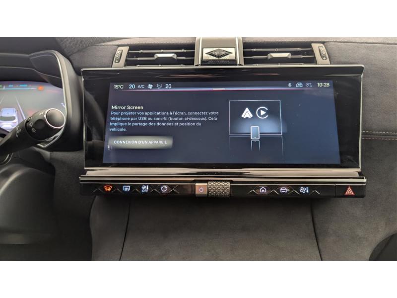 ABS avec répartiteur électronique de freinage (REF) et Aide au Freinage d'Urgence (AFU) + Aide au démarrage en penteAccès et démarrage mains libresAccoudoir central ARAccoudoir central en Toile DS avec rangementAide au stationnement AV/AR et Caméra de reculAirbags frontaux (passager déconnectable), latéraux AV, rideaux AV/ARAlerte Attention ConducteurAlerte de franchissement involontaire de ligneAllumage automatique des feux Avec commutation automatique des feux de routeBanquette AR 2/3 - 1/3Barres de toit noir brillantClimatisation automatique bi-zoneCombiné numérique 12.3" HDContrôle électronique de stabilité de l'attelageContrôle dynamique de stabilité (ESP) avec antipatinage des roues (ASR)Détection de sous-gonflageDouble canule d'échappement chroméeDS ACTIVE SCAN SUSPENSIONDS IRIS SYSTEM Système d'infotainment personnalisable de dernière générationDS LIGHT VEIL Feux de jour à LEDDS PIXEL LED VISION 3.0Eclairage d'accueil et d'accompagnementEclairage d'ambiance à LEDEclairage de cave à pieds à LEDEcran tactile capacitif 12’’ HDEssuie-vitre AV à déclenchement et cadencement automatiques + Buses de lavageFrein de stationnement électriqueFreinage d'urgence automatique piloté par caméra et radarIntérieur Alcantara Noir profond : Sellerie Alcantara Noir profond avec Toile DS Console centrale en Alcantara Noir Profond Panneaux de portes en Alcantara Noir Profond et surpiqûres Carmin et Or Planche de bord Alcantara Noir Profond et surpiqûres Carmin et Or Volant Cuir fleur Jantes alliage 19'' SILVERSTONEKit de dépannageLève-vitres AV/AR électriques, séquentiels et avec fonction antipincementMirror Screen sans fil via Wifi Compatible Apple CarPlay et Android AutoMonogrammes AR noir brillantNavigation 3D Connectée Information trafic en temps réelPédalier et le repose-pied aluminiumPare-brise teinté acoustiquePoignées extérieures couleur caisse avec insert chroméPrédisposition Plancher modulable à 2 positionsRégulateur/Limiteur de vitesseRétroviseur intérieur électrochrome sans cadreRétroviseurs extérieurs électriques dégivrants, rabattables électriquement Fonction électrochrome côté conducteur, Projection au sol du logo DS, Indexé à la marche AR côté passagerRétroviseurs extérieurs avec embase couleur caisse et coque noir brillantRadio numérique terrestre (DAB)Reconnaissance étendue des panneaux de signalisationSélecteur de mode de conduiteSièges AV électriques Réglage électrique du siège, réglage lombaire pneumatique, réglage mécanique du nez de coussinSurveillance d'angles mortsVitres AR et lunette AR surteintéesVolant réglable en hauteur et profondeur