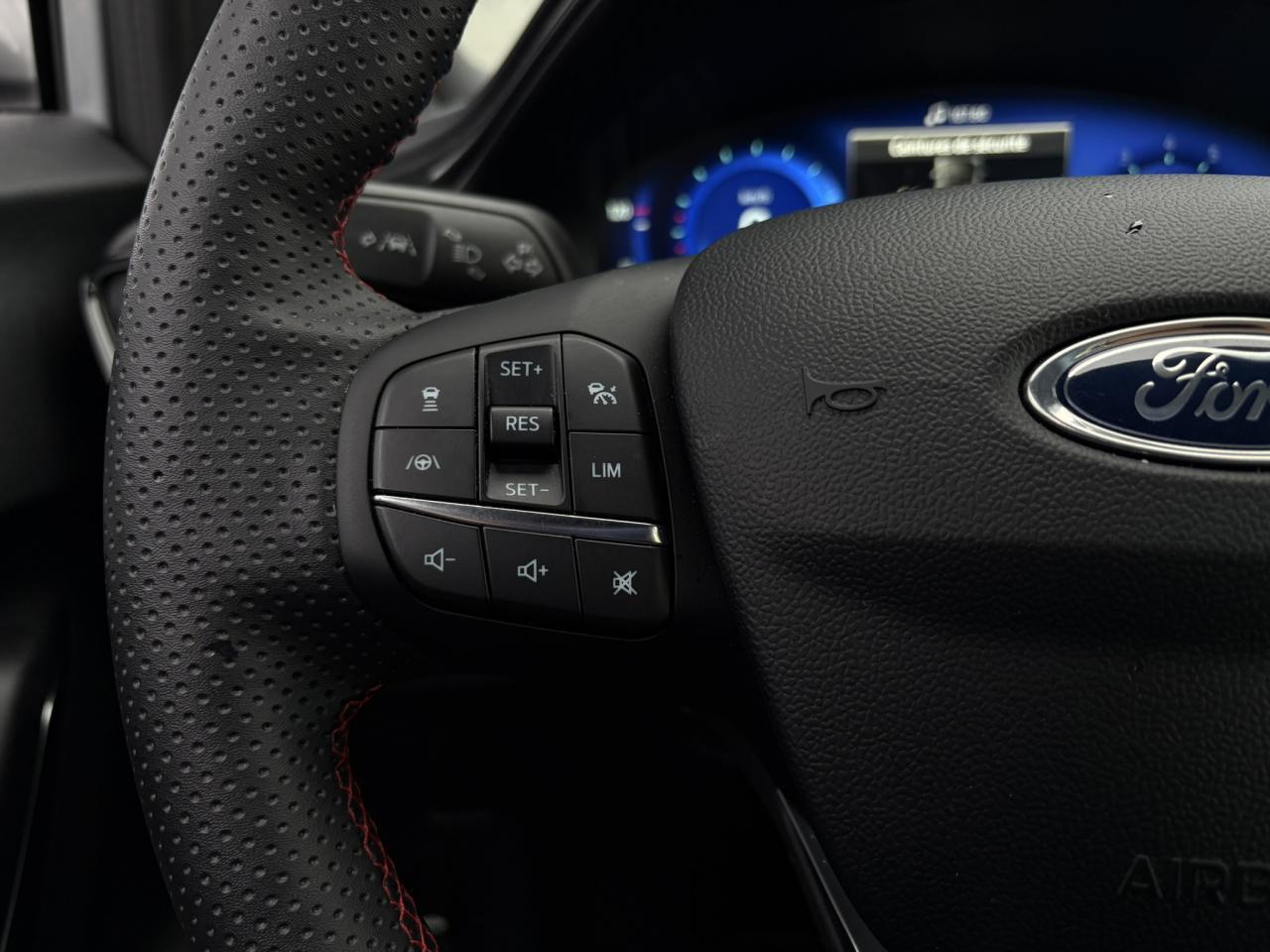 2 Fixations Isofix à l'arrière3 appuie-tête arrière5 ceintures de sécurité 3 points5 Modes de conduite sélectionnables (normal, eco, sport, faible adhérence, trail)Aide au démarrage en côteAide au maintien dans la voie avec détection des bas-côtésAide au stationnement arrièreAirbags frontaux, latéraux (thorax) et rideauxAlerte d'oubli de ceintures avant/arrièreAlerte de franchissement Involontaire de ligneAllumage automatique des projecteursAntipatinageAppuie-tête arrière réglables en hauteurAssistance au freinage d'urgenceAvertisseur de freinage d'urgenceBadges ST-LineBanquette arrière rabattable 40/60Bas de caisse couleur carrosserieBecquet arrière couleur carrosserieBouton de démarrage "Ford Power"Combiné d'instrumentation numérique 12,3" avec EcomodeConsole centrale avant avec deux porte-gobelets rétroéclairésConsole centrale avec accoudoir et rangementsContour des vitres latérales en noir finition brillanteCorrecteur électronique de trajectoire ESPDésactivation de l'airbag du passager avantDirection assistée électriqueEclairage d'ambiance intérieurFeux arrière à LEDFeux de jour à LEDFeux de route intelligents (passage feux de croisement/route automatique)FordPass Connect avec modem embarqué et fonction eCallFrein à disques à l'avantGrille de calandre ST-LineKit de réparation pneumatiqueLevier de frein à main gainé de SensicoLevier de vitesses gainé de SensicoLimiteur de vitesse intelligentLogo MHEV sur HayonPédalier designPack ConfortPalettes au volantPare-chocs couleur carrosseriePhares avant antibrouillard avec fonction d'éclairage d'anglePrise 12 V sur console centrale avantRégulateur de vitesseRétroviseur intérieur électrochromeRétroviseurs extérieurs électriques couleur carrosserie, dégivrant et rabattables avec rappels de clignotantsSellerie Mixte noire tissu Sensico Tire on Eton avec renforts latéraux SalernoSiège conducteur réglable en hauteur avec soutien lombairesSiège passager réglable en hauteur avec soutien lombaireSortie d'échappement chroméeSuspensions sportSystème de freinage antiblocage (ABS)Système de Navigation Europe et points d'intérêt MichelinSystème de prévention de collision avec freinage post-collision et détection piétonsSystème de surveillance de pression des pneusSystème MyKey (seconde clé programmable)Tapis de sol avant avec surpiquresTrappe à carburant Ford EasyFuelVerrouillage centralisé à distanceVitres électriques avant et arrière avec descente et remontée à impulsionVitres arrière surteintéesVolant à méplat 3 branches ST-Line avec surpiqûres rouges
