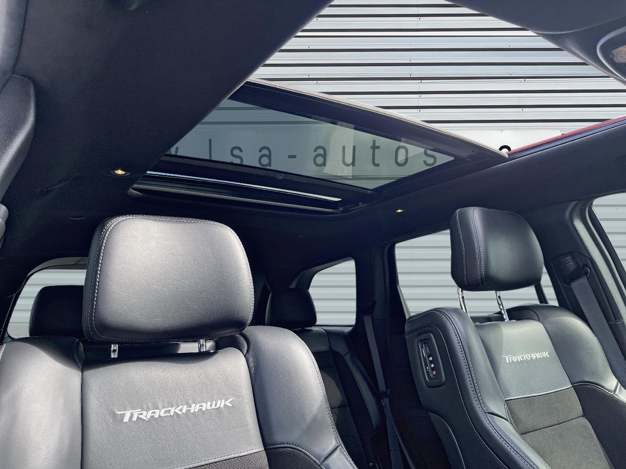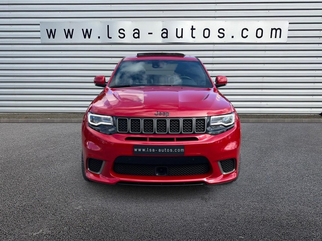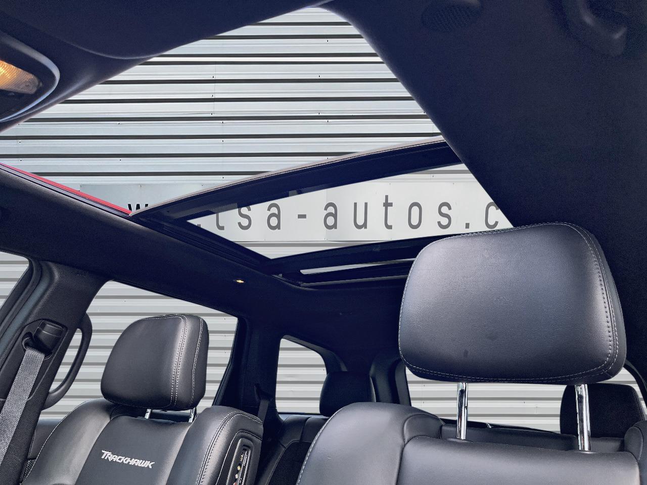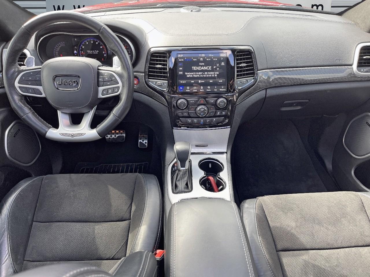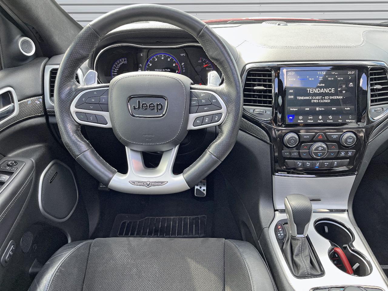 ABS - Système antiblocage des roues avec gestion différenciée en fonction de la nature du solAccoudoir central avant avec compartiment de rangementAffichage de la pression des pneusAide aux secouristes - Coupure de l'arrivée de carburant ; déverrouillage automatique des portes pour faciliter l'accès des secouristes ; éclairage de l'habitacle pour voir les occupants de l'extérieurAirbag de genoux (conducteur)Airbags frontaux (conducteur et passager) à déploiement variableAirbags latéraux additionnels (dans les sièges conducteur et passager)Airbags latéraux de type rideau avant et arrièreAlarme périmétrique de contrôle des ouverturesAlarme volumétriqueAntenne de toit « aileron de requin »Antibrouillard arrièreAppuie-tête avant actifs (système de protection contre le coup du lapin)Badges Trackhawk et SuperchargedBanquette arrière fractionnée 60/40 rabattable à plat et inclinable à 12°Boîte de vitesse automatique à 8 rapports et levier de vitesse "E-Shift "Cache-bagages à enrouleur et amovible dans le coffreCalandre noireCapteur de luminositéCapteurs de pluieClimatisation automatique bizoneColoris pastel (Bright White)Commandes audio au volantConnexions Apple CarPlay et Android AutoConsole centrale en finition métalliséeDiffuseur arrière sportEclairage extérieur de courtoisieEclairage intérieur à LEDEnter-N-Go : système d'ouverture et de démarrage sans cléESP - Système de régulation du comportement dynamiqueEtriers de freins jaunesFeux arrière à LEDFeux de jour à LEDFilet de coffreFiltre à air pour l'habitacleFonction mémorisation : siège conducteur, rétroviseurs extérieurs et stations de radioFreins Brembo Haute performance 6 pistons; avant à disques ventilés 400mm ; arrière disque de 350mmGarnissage en cuir sur le tableau de bord, les contreportes et l'accoudoir centralGrilles de haut-parleurs métalliséesHaut-parleurs avec annulation active de bruitHayon arrière à ouverture et fermeture électriqueInserts de la console centrale en finition PlatinumInserts du combiné d'instrumentation noirsJantes alliage 20" Pirelli All Season 295/45 ZR20 110YMenu spécifique Performance Trackhawk dans le système UconnectMode voiturierModule de connectique : Prise jack, Port USB 2.0 et lecteur de carte SDOrdinateur de bord : affichage digital sur écran 7 ” TCM (800 x 454)Ouïes de refroidissement à l'avantPack FreedomPalettes de changement de vitesses au volantPare-soleil coulissants avec miroirs de courtoisie éclairés intégrésPédalier chroméPoignées de portes couleur carrosseriePommeau de levier de vitesses gainé de cuir perforé SportPort USB 2.0 pour les places arrièrePorte-gobelets rétroéclairésPrises auxiliaires 12 V (console centrale et accoudoir central)Projecteurs avant adaptatifsProjecteurs bi-xénon avec lave-phares intégrés et réglage automatique de niveauQuadra-TracQuadruple sortie d'échappement noireRéglage lombaire électrique des sièges avantRégulateur de vitesse auto-adaptatif avec fonction embouteillageRétroviseur intérieur photochromatique avec microphone intégréRétroviseurs avec réglage électrique et fonction dégivrageRétroviseurs extérieurs photochromatiques rabattables électriquement avec fonction mémorisationRoue de secours compacte 20''Selec-Track : Sélecteur de modes de conduiteSeuils de portes rétroéclairésSièges arrière chauffantsSièges avant chauffantsSièges avant électriques avec réglage 8 points conducteur et passagerSièges avant ventilésSièges et contre-portes en cuir Laguna Performance avec logo TrackhawkSmartbeam : commutation automatique feux de route/feux de croisementSpoiler arrière couleur carrosserieSuspension adaptative Bilstein CompetitionSuspension sport (-17 mm)Système anti-démarrage Sentry KeySystème anti-louvoiement en conditions de tractageSystème antipatinage 4 roues par action sur les freinsSystème audio Harman Kardon High Performance: 19 haut-parleurs d'une puissance de 825 wattsSystème d 'aide au freinage d'urgenceSystème d'aide au démarrage en côteSystème d'avertissement anticollision actifSystème d'avertissement de franchissement de ligne avec correctionSystème de contrôle de la descenteSystème de détection de présence arrièreSystème de fixation pour siège enfant ISOFIXSystème de Launch Control (Aide aux départs arrêtés)Système de Navigation GPS Uconnect 3D avec écran tactile 8.4''Système de séchage des freins et répartiteur électronique de freinageSystème de surveillance des angles mortsSystème Park Assist : assistance au stationnement parallèle/perpendiculaire semi-automatiqueSystème ParkSense : aide au stationnement avec capteurs avant et arrièreSystème ParkView : Caméra de recul avec affichage sur l'écran multimédiaSystème préventif anti retournement (ERM)Système téléphonie mains-libres Uconnect et fonction reconnaissance vocaleTachymètre 320 km/hTapis de coffre PremiumTapis de sol avec logo à l'avant et à l'arrièreTrappe de carburant « capless » (sans bouchon) à verrouillage électriqueVolant avec logo TrackhawkVolant chauffant